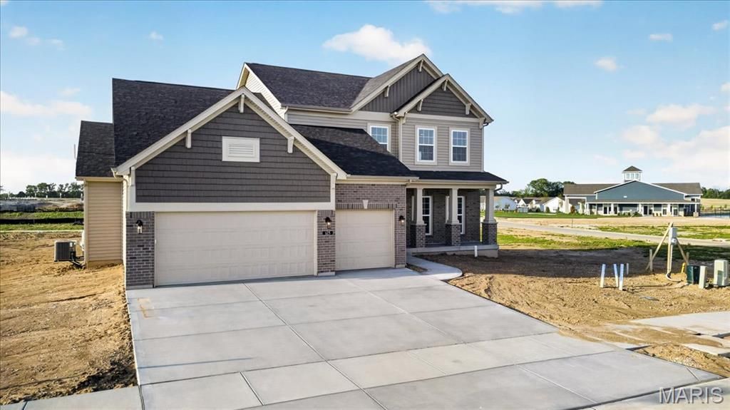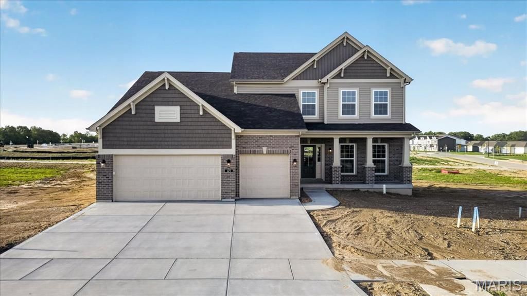 Located in the sought-after Montage community, this 1.5-story Expanded Bridgeport plan offers 3,340 square feet of well-designed living space with a Craftsman-style exterior. The home includes 4 bedrooms, 3.5 baths, and a 3-car garage. The kitchen features quartz countertops, a large island, two-tone 42 custom cabinetry with crown molding, soft-close doors, dovetail drawers, and stainless steel gas appliances. The open layout connects the kitchen to the breakfast room and family room, complete with a gas fireplace and a window wall for natural light. The main floor includes a study, laundry room with boot bench, and a spacious primary suite with a walk-in closet and private bath featuring a freestanding tub and separate spa like shower with heavy glass shower door. The upper level offers three additional bedrooms, two full baths, and a bonus room. Additional highlights include laminate flooring in main living areas, a full unfinished basement with rough-in for future bath, 8' pour, and egress windows. Enjoy the 12x20 composite patio and included landscaping package. Zoned HVAC, smart thermostat, and energy-efficient insulated windows complete this move-in ready home in the Wentzville School District.