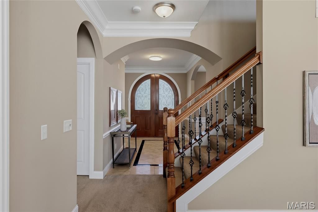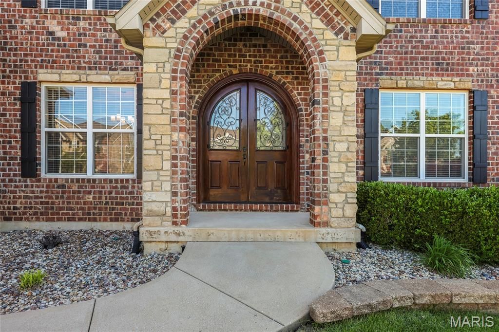 Stunning 1.5 story home located in the sought after Manors of Fieldstone Farms subdivision in O'Fallon! This home boasts over 5,000 square feet of living space with 5 bedrooms, 4.5 bathrooms, and finished lower level. The front door opens to the entry foyer with a coat closet and tile floors. The entry foyer opens to the formal dining room with gleaming hardwood floors, a coffered ceiling, and wainscoting. The living room features a gas fireplace, built-in bookshelves, wall of windows, and opens to the kitchen.The kitchen boasts 42 inch cabinetry with crown molding, granite countertops, soft close drawers, stainless steel appliances, new gas range (2025), new microwave (2026), refrigerator which is included, a tile backsplash, center island, pantry, planning desk, and dining area with a bay window. The primary bedroom features a bay window, walk-in closet with custom shelving, and a luxurious bathroom with a dual vanity, tile floors, soaking tub, and separate shower with a tile surround. The powder room, mud room with a closet, and laundry room with a utility sink complete the main level. The second floor features a huge loft and 4 bedrooms. One bedroom has dual closets and double doors. Another bedroom has a private full bathroom and walk-in closet. The other two bedrooms have walk-in closets and a Jack and Jill bathroom. The finished, walkout lower level boasts a huge recreation room, full bathroom, home theatre, and ample storage space. The recreation room features a gas fireplace, wainscoting, built-in speakers, and a custom wet bar with granite countertops, a tile backsplash, colored LED lights, and beer taps. Other highlights include: 3 car garage, new roof (2025), new humidifier (2024), arched 2 panel doors throughout, wrought iron spindles, crown molding throughout most of the main level, archways throughout most of the main level, irrigation system, zoned HVAC, water softener, and painted neutral colors throughout. Relax outside on the wood back deck with a pergola and retractable shade, or on the stone back patio and enjoy the level yard! The patio boasts a pergola with a fan, TV mount, custom fireplace, firepit area, and speakers. Location could not be better - close to major highways, restaurants, shops, schools, and walking distance to the subdivision pool!