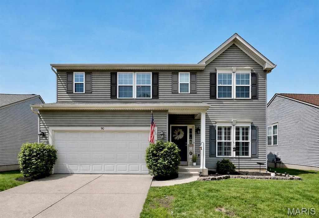 COMING SOON! Showings start Thursday 4/30 after 5pm. Experience the perfect combination of space, style, and convenience in this stunning 2-story, 5 bed, 3.5 bath home just minutes from it all. With a charming covered porch, fenced yard, and a backdrop of tree-lined common ground, this property offers both privacy and curb appeal. Inside, you'll love the stylish plank flooring throughout most of the main level, designed for both beauty and easy maintenance.The main floor features a formal dining room and a bright, inviting great room with gas fireplace and walls of windows that fill the space with natural light. The kitchen is thoughtfully designed with 42 white cabinets, stainless steel appliances, walk-in pantry, center island, and a deep stainless sink with built-in drying rack. The breakfast room opens to a maintenance-free composite deck-perfect for morning coffee or entertaining guests.Upstairs, the turn-back staircase leads to a spacious primary suite with a custom-organized walk-in closet, dual vanity, soaking tub, and separate shower. Three additional bedrooms all include walk-in closets, plus a hall bath and a large laundry room with extensive built-in organization for plenty of storage.The finished lower level expands your living space with a Rec room, 5th bedroom, and a beautifully updated full bath featuring a subway tile shower and stylish vanity. Walk out to a patio and enjoy the level, fenced yard with irrigation system.Only 9 years old with newer systems, plantation shutters, and a 2-car garage, this home is ideally located near Gravois Bluffs and George Winter Park for shopping, dining, and outdoor recreation.